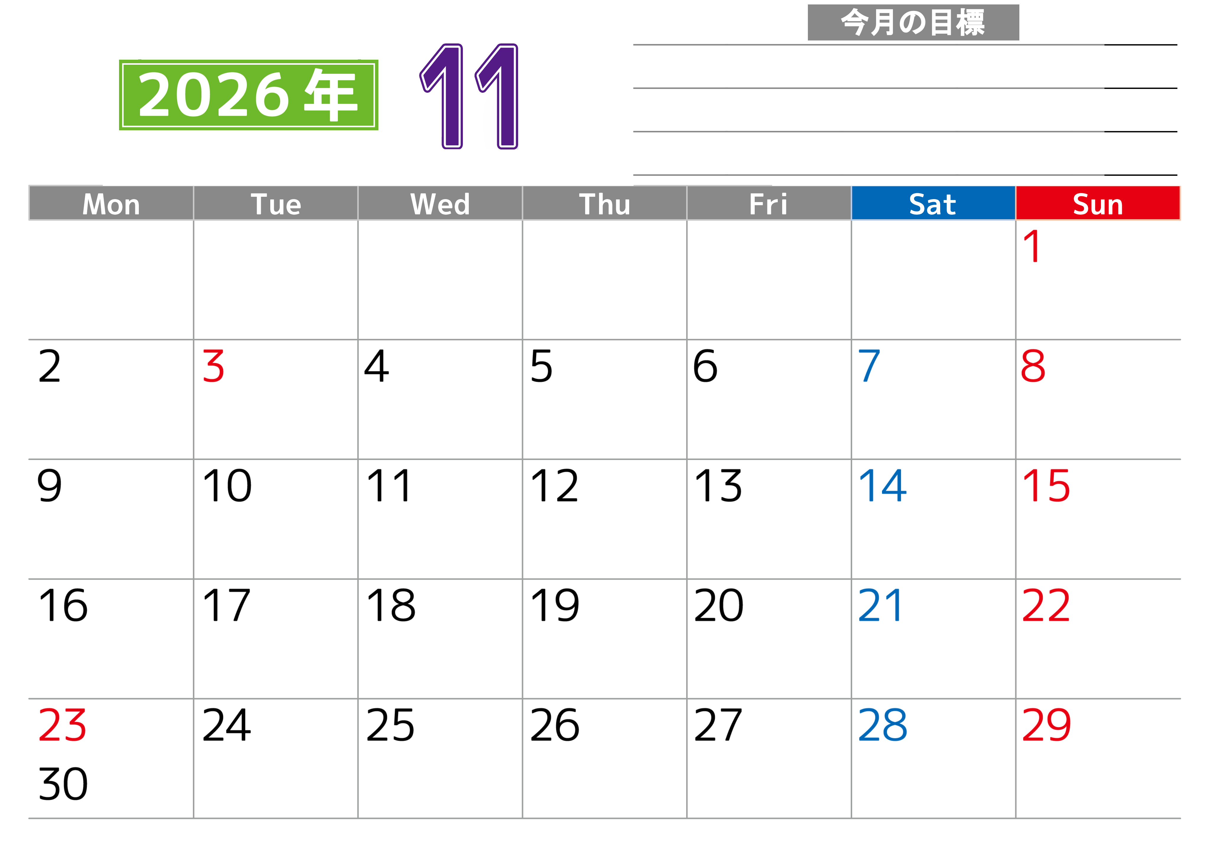 2026年・無料のカレンダーテンプレート 2026年11月カレンダーは横型月曜始まりで勉強や仕事の目標を実現♪使いやすい無料A4サイズ♪(2026-01601101) 素材状デザイン王 2025年4月13日 2026年11月カレンダーは横型月曜始まりで勉強や仕事の目標を実現しましょう。使いやすいダウンロードが無料なA4サイズのフリー素材です。(2026-01601101) 11月 横型のカレンダー 月曜始まり 目標 カレンダーデザイン-0160