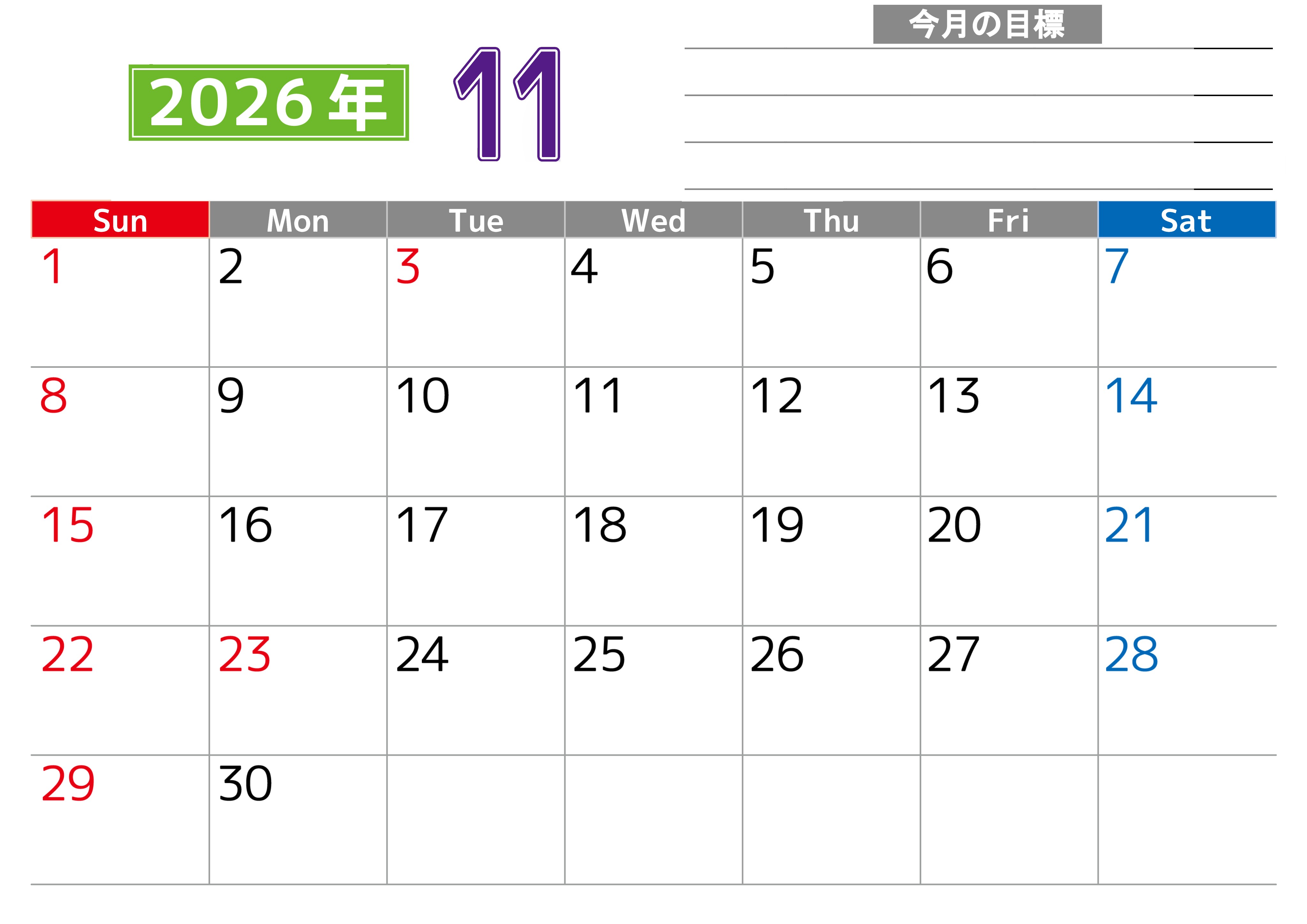 2026年11月カレンダーは横型日曜始まりで勉強や仕事の目標を実現♪使いやすい無料A4サイズ♪(2026-01601100)