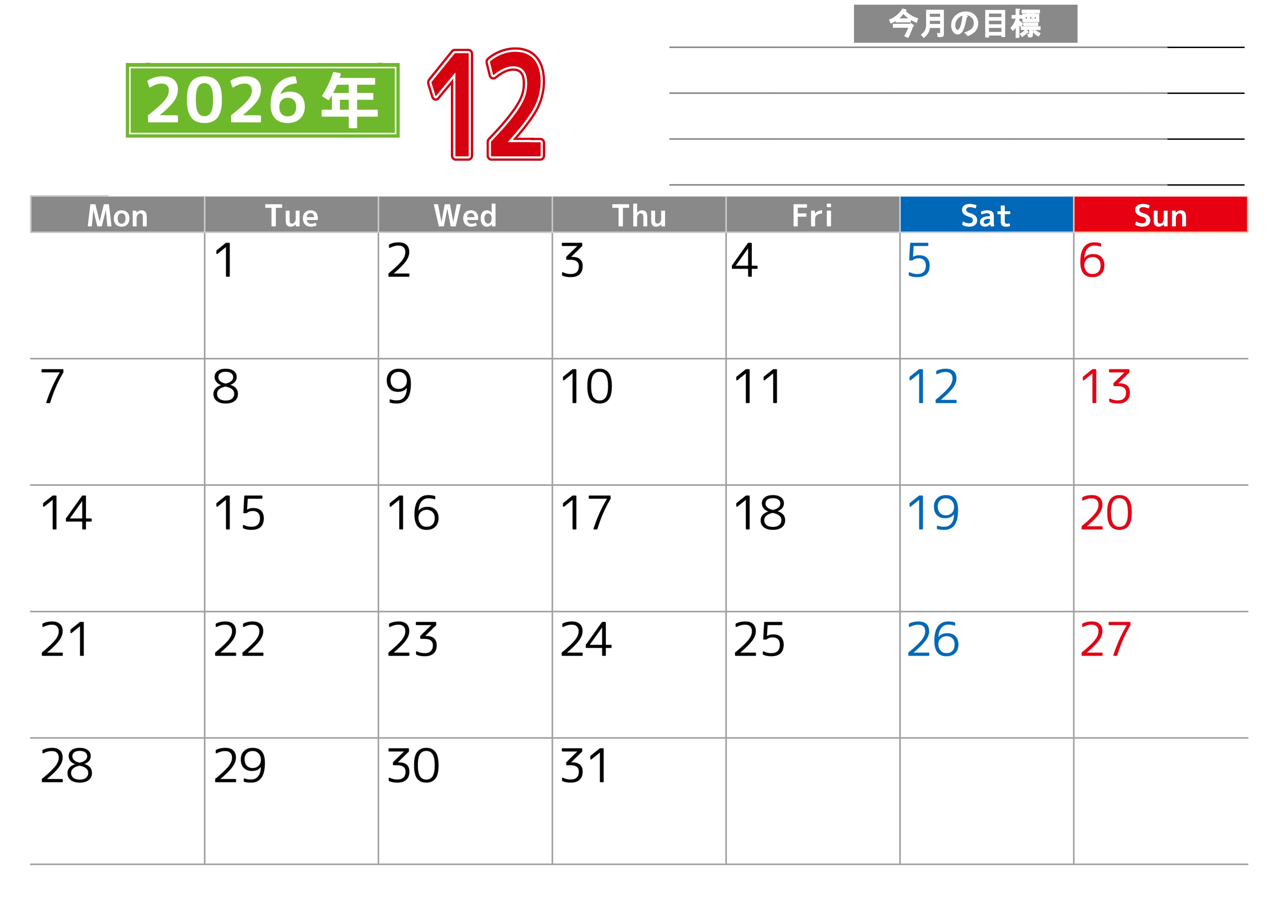 2026年12月カレンダーは横型月曜始まりで勉強や仕事の目標を実現しましょう。使いやすいダウンロードが無料なA4サイズのフリー素材です。(2026-01601201)