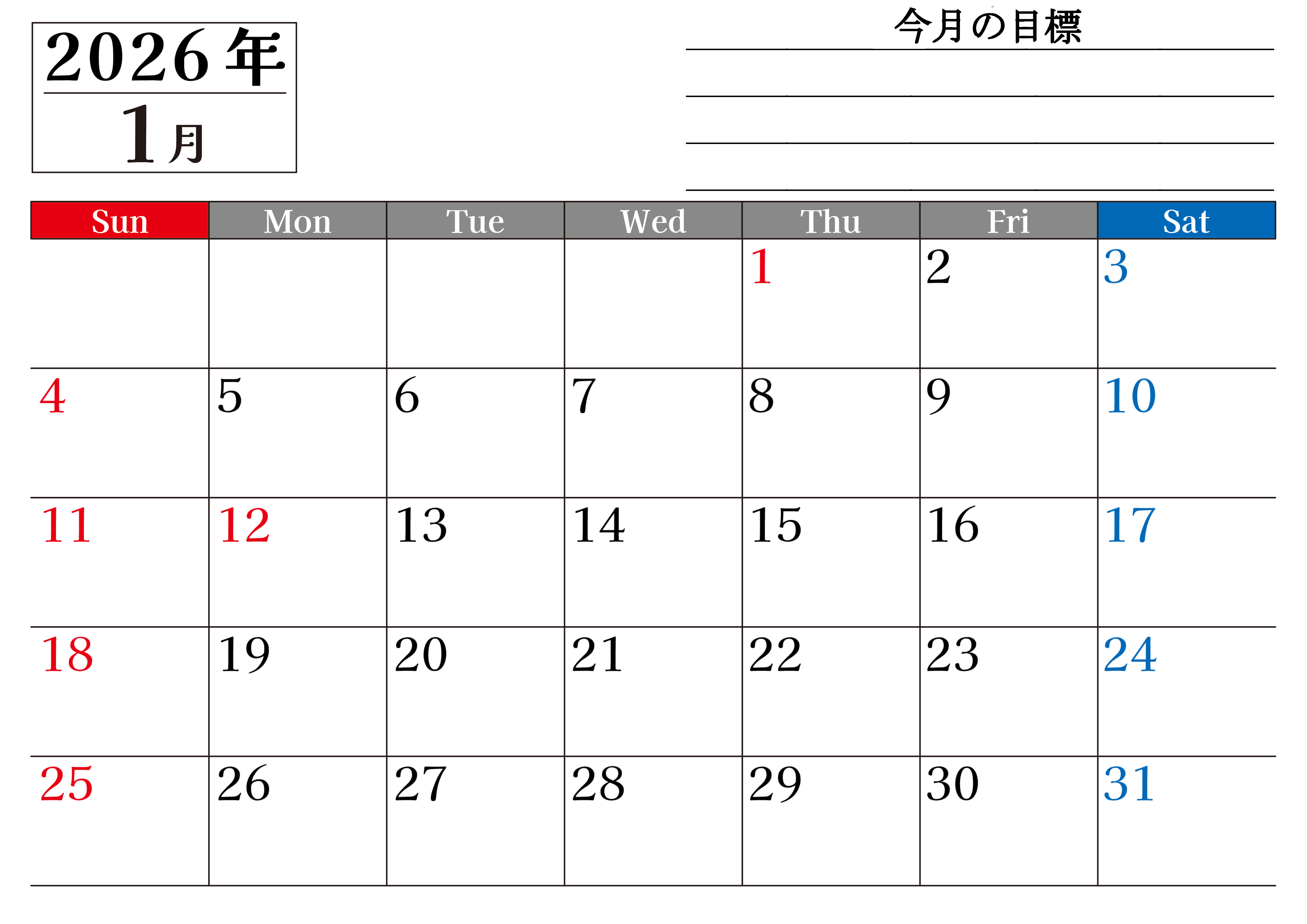 2026年・無料のカレンダーテンプレート 2026年1月カレンダーは横型日曜始まりで目標管理もできて一石二鳥!忙しい毎日をカレンダーで整理:無料(2026-01610100) 素材状デザイン王 2025年4月13日 2026年1月カレンダーは横型日曜始まりで目標管理もできて一石二鳥です。忙しい毎日をカレンダーで整理して夢を実現させましょう。ダウンロードは無料で簡単です。(2026-01610100) 1月 横型のカレンダー 日曜始まり 目標 カレンダーデザイン-0161