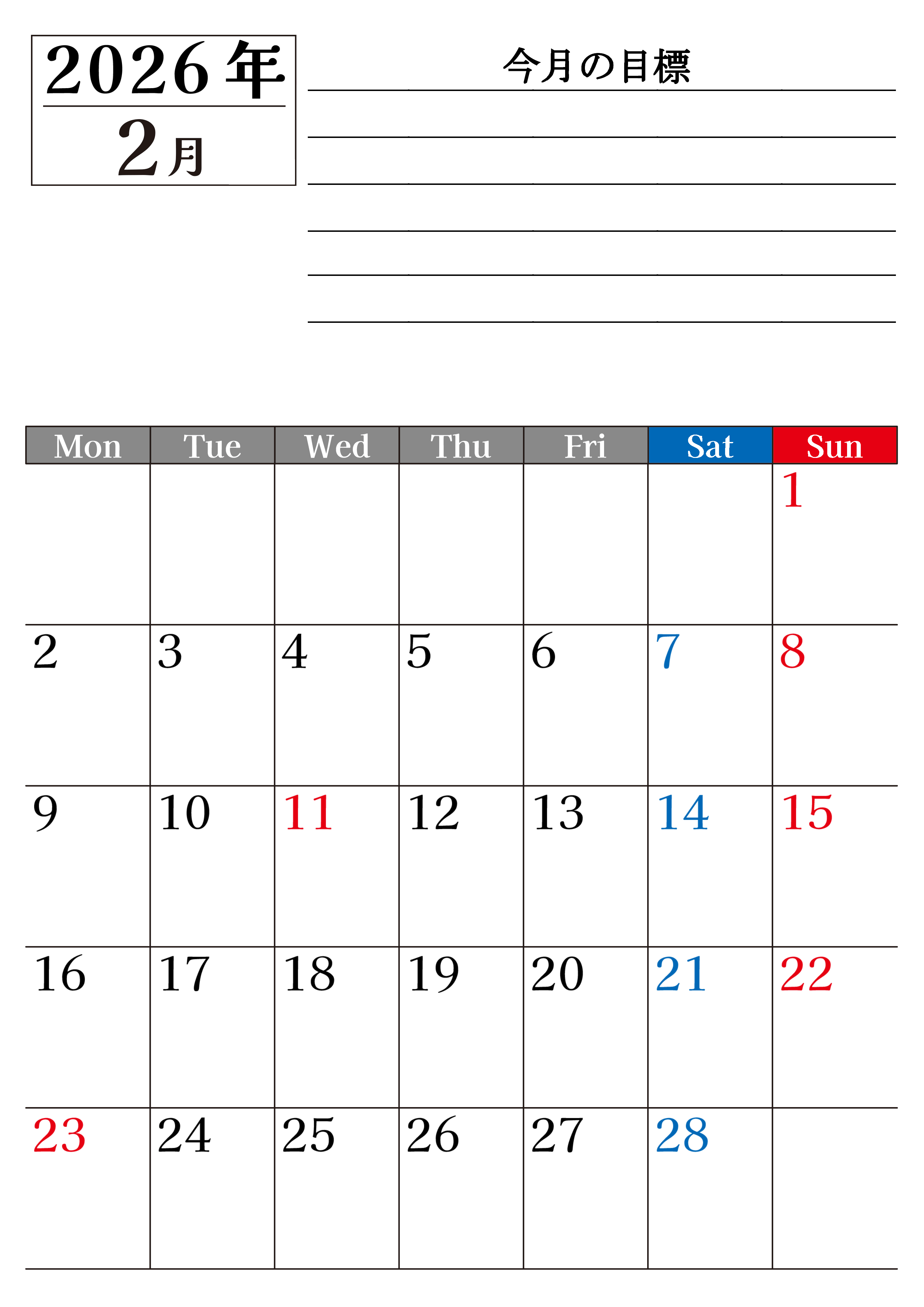 2026年2月カレンダーは縦型月曜始まりで目標管理もできて一石二鳥です。忙しい毎日をカレンダーで整理して夢を実現させましょう。ダウンロードは無料で簡単です。(2026-01610211)
