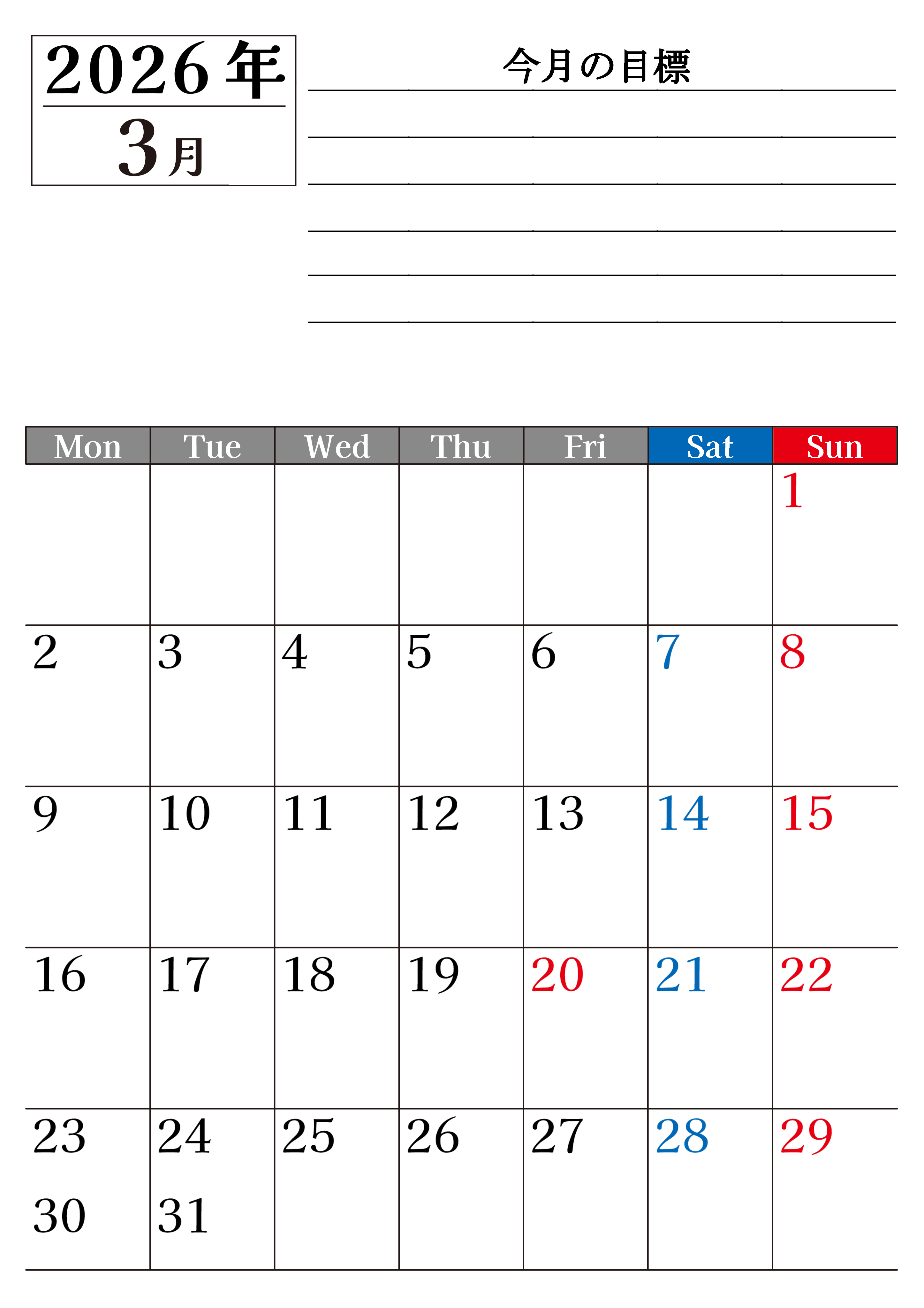 2026年・無料のカレンダーテンプレート 2026年3月カレンダーは縦型月曜始まりで目標管理もできて一石二鳥!忙しい毎日をカレンダーで整理:無料(2026-01610311) 素材状デザイン王 2025年4月13日 2026年3月カレンダーは縦型月曜始まりで目標管理もできて一石二鳥です。忙しい毎日をカレンダーで整理して夢を実現させましょう。ダウンロードは無料で簡単です。(2026-01610311) 3月 縦型のカレンダー 月曜始まり 目標 カレンダーデザイン-0161