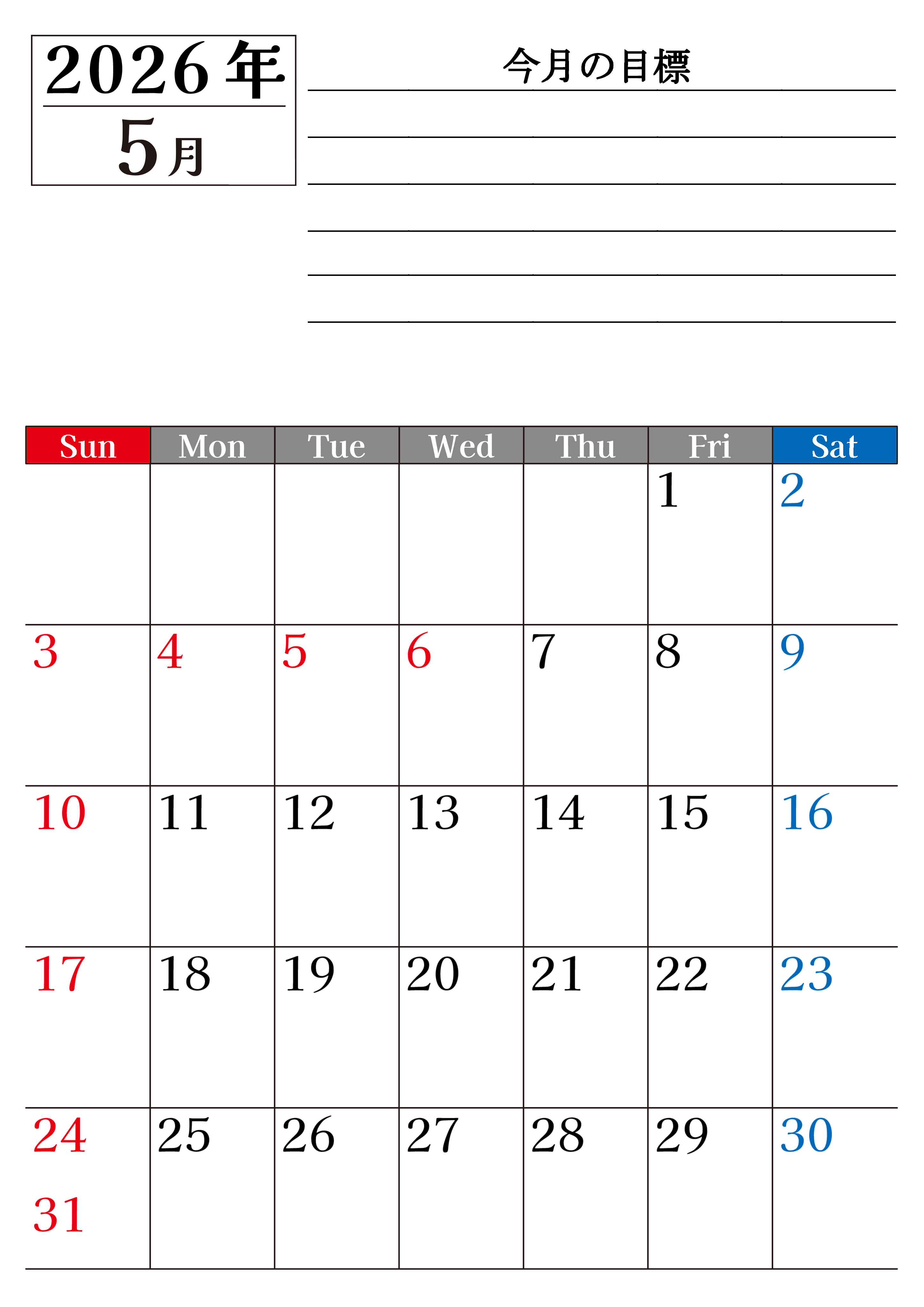 2026年・無料のカレンダーテンプレート 2026年5月カレンダーは縦型日曜始まりで目標管理もできて一石二鳥!忙しい毎日をカレンダーで整理:無料(2026-01610510) 素材状デザイン王 2025年4月13日 2026年5月カレンダーは縦型日曜始まりで目標管理もできて一石二鳥です。忙しい毎日をカレンダーで整理して夢を実現させましょう。ダウンロードは無料で簡単です。(2026-01610510) 5月 縦型のカレンダー 日曜始まり 目標 カレンダーデザイン-0161