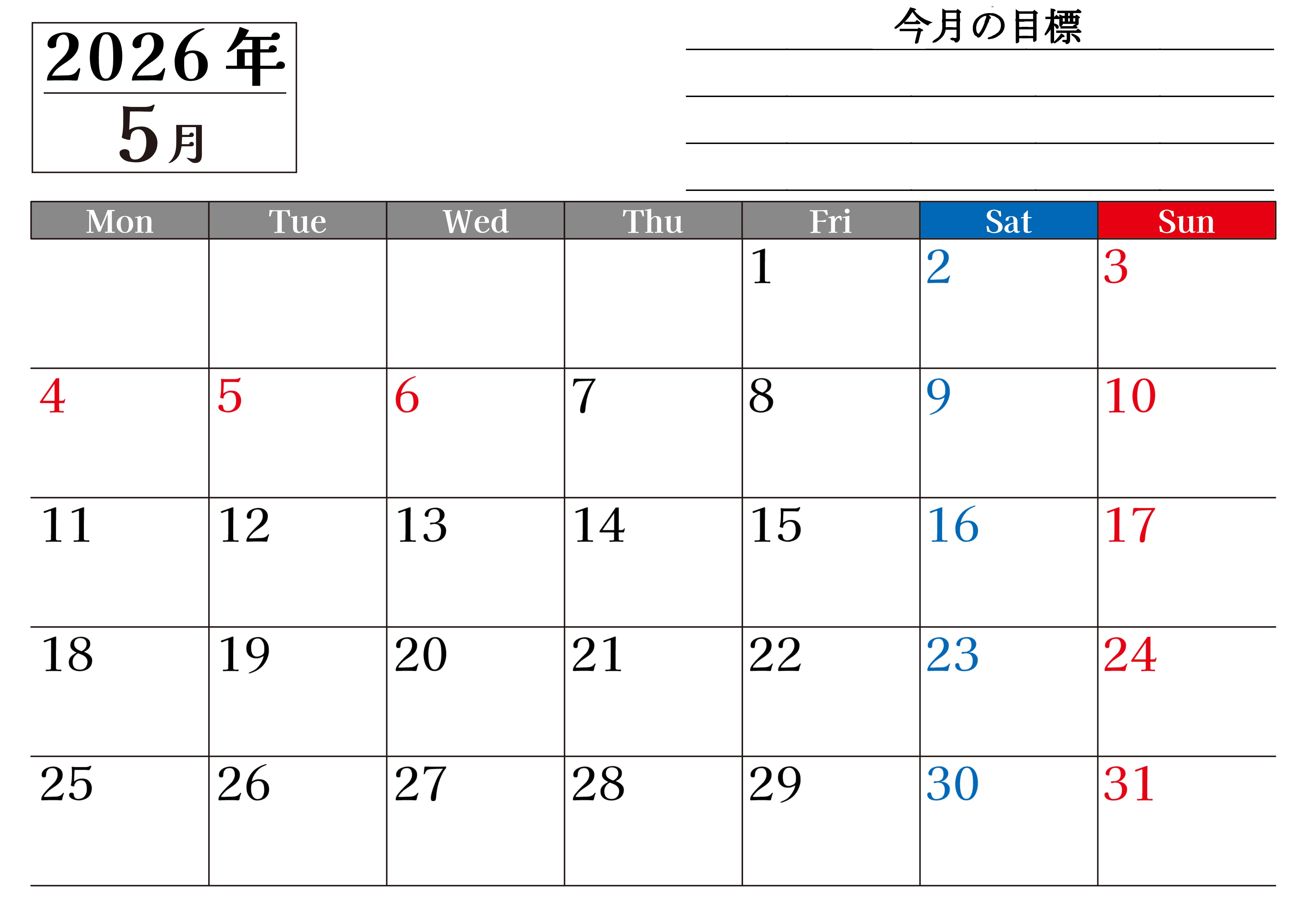 2026年5月カレンダーは横型月曜始まりで目標管理もできて一石二鳥!忙しい毎日をカレンダーで整理:無料(2026-01610501)