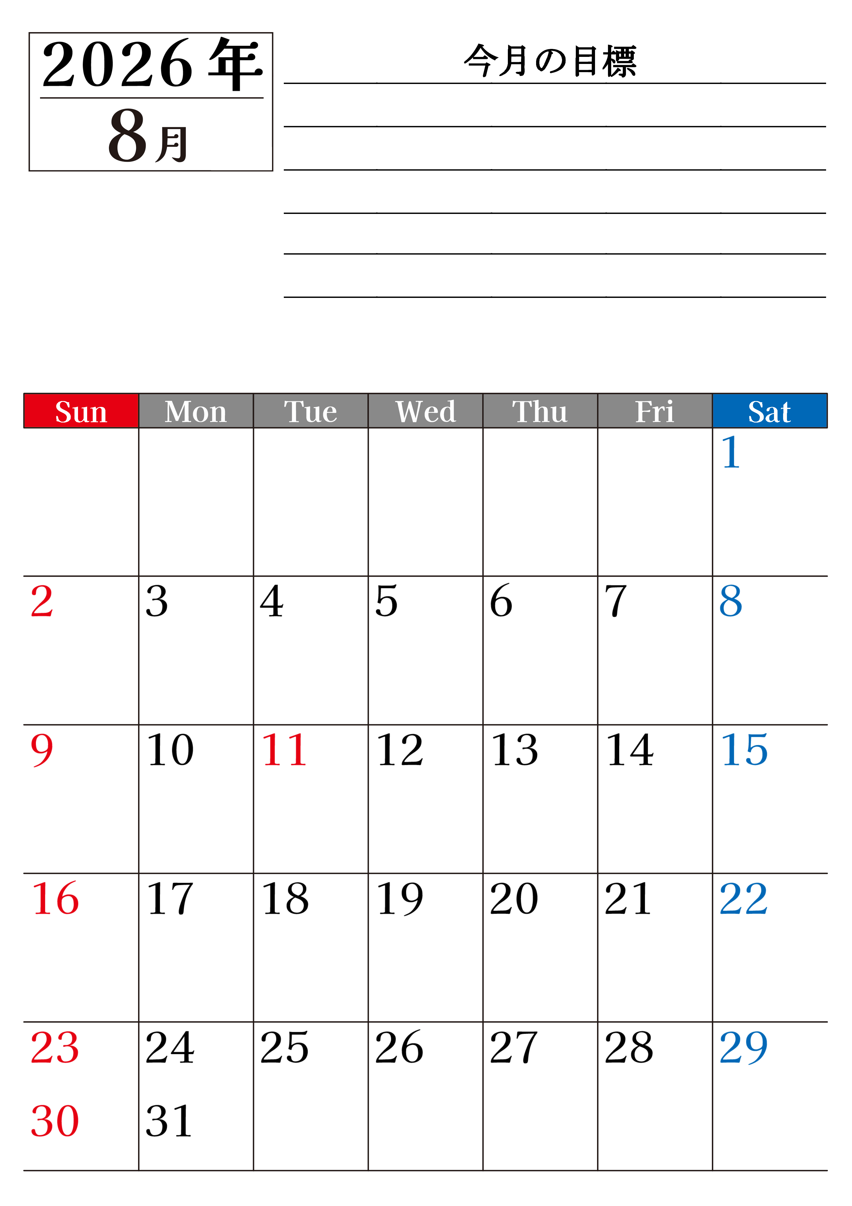 2026年8月カレンダーは縦型日曜始まりで目標管理もできて一石二鳥!忙しい毎日をカレンダーで整理:無料(2026-01610810)