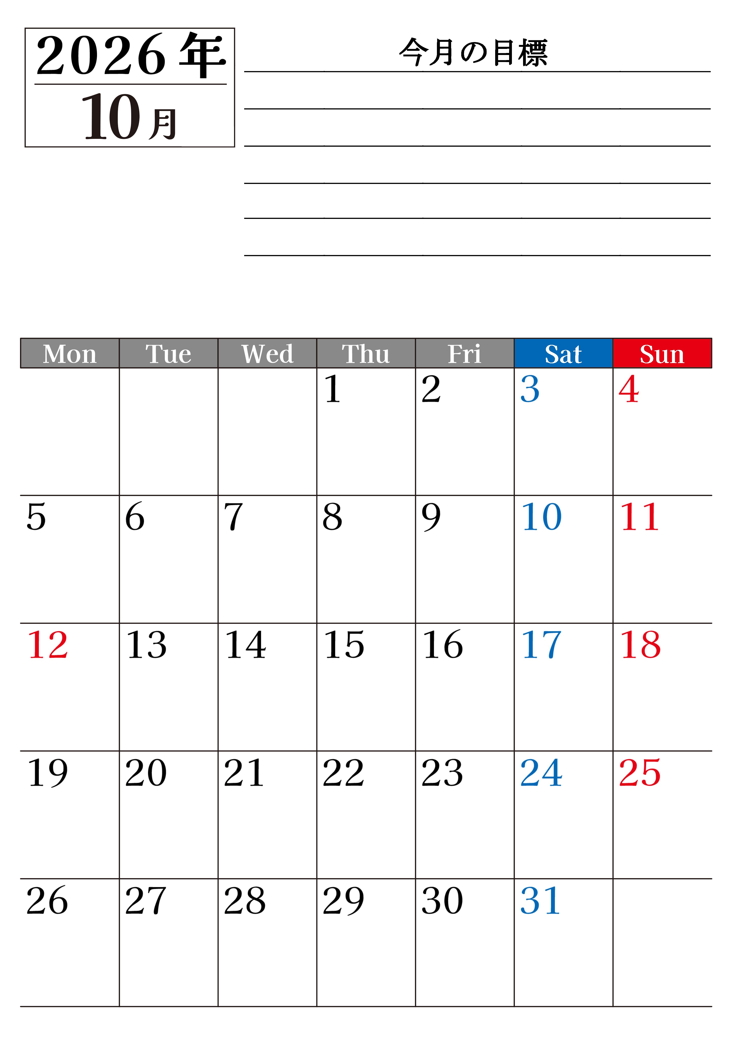 2026年10月カレンダーは縦型月曜始まりで目標管理もできて一石二鳥!忙しい毎日をカレンダーで整理:無料(2026-01611011)