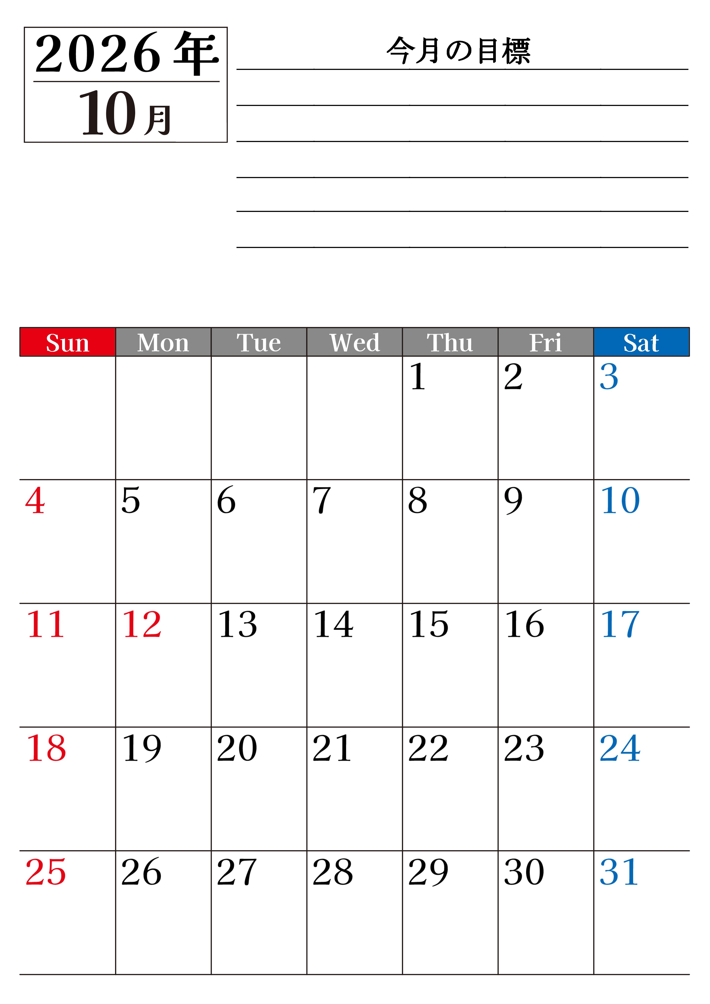 2026年10月カレンダーは縦型日曜始まりで目標管理もできて一石二鳥!忙しい毎日をカレンダーで整理:無料(2026-01611010)