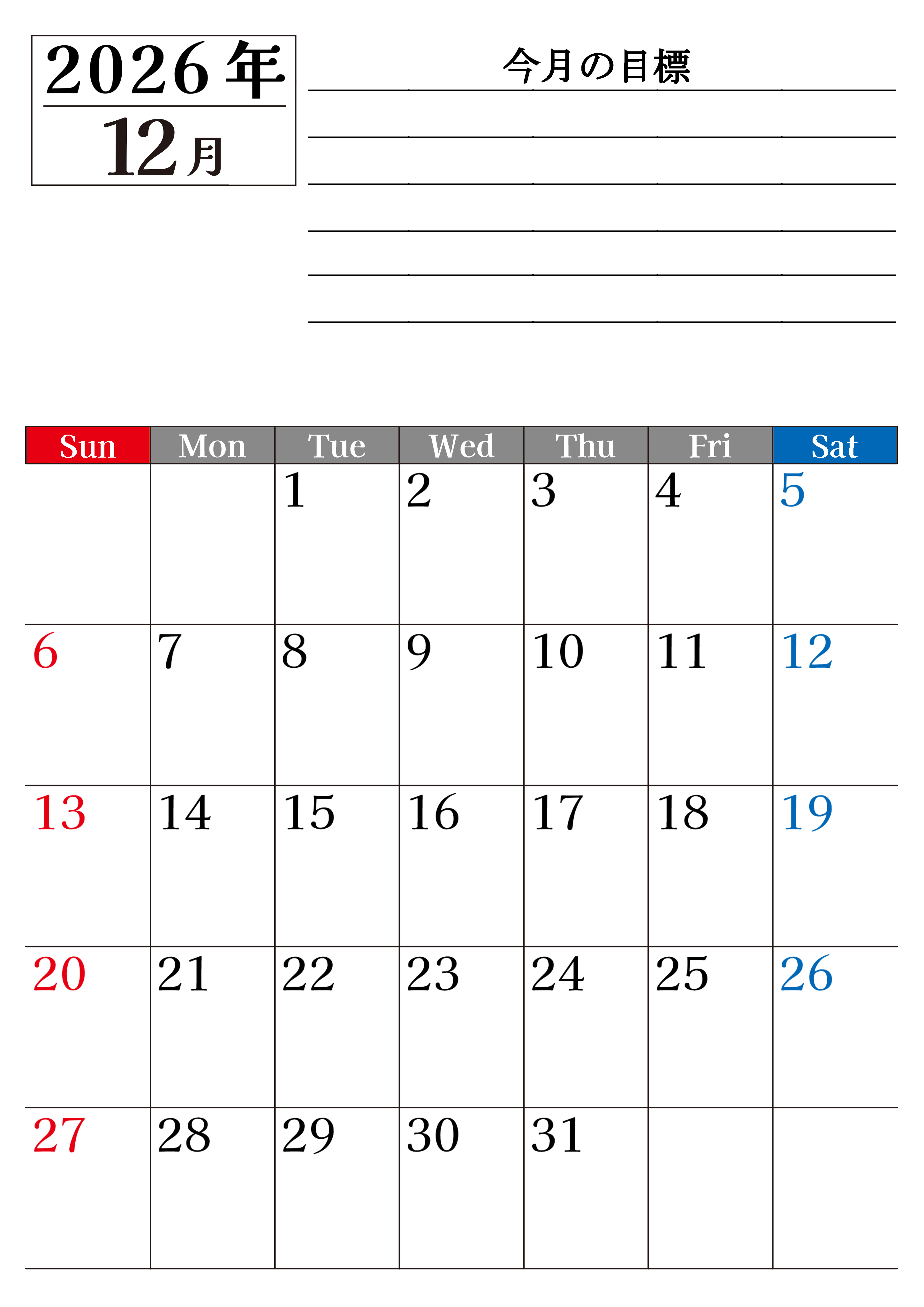 2026年・無料のカレンダーテンプレート 2026年12月カレンダーは縦型日曜始まりで目標管理もできて一石二鳥!忙しい毎日をカレンダーで整理:無料(2026-01611210) 素材状デザイン王 2025年4月13日 2026年12月カレンダーは縦型日曜始まりで目標管理もできて一石二鳥です。忙しい毎日をカレンダーで整理して夢を実現させましょう。ダウンロードは無料で簡単です。(2026-01611210) 12月 縦型のカレンダー 日曜始まり 目標 カレンダーデザイン-0161