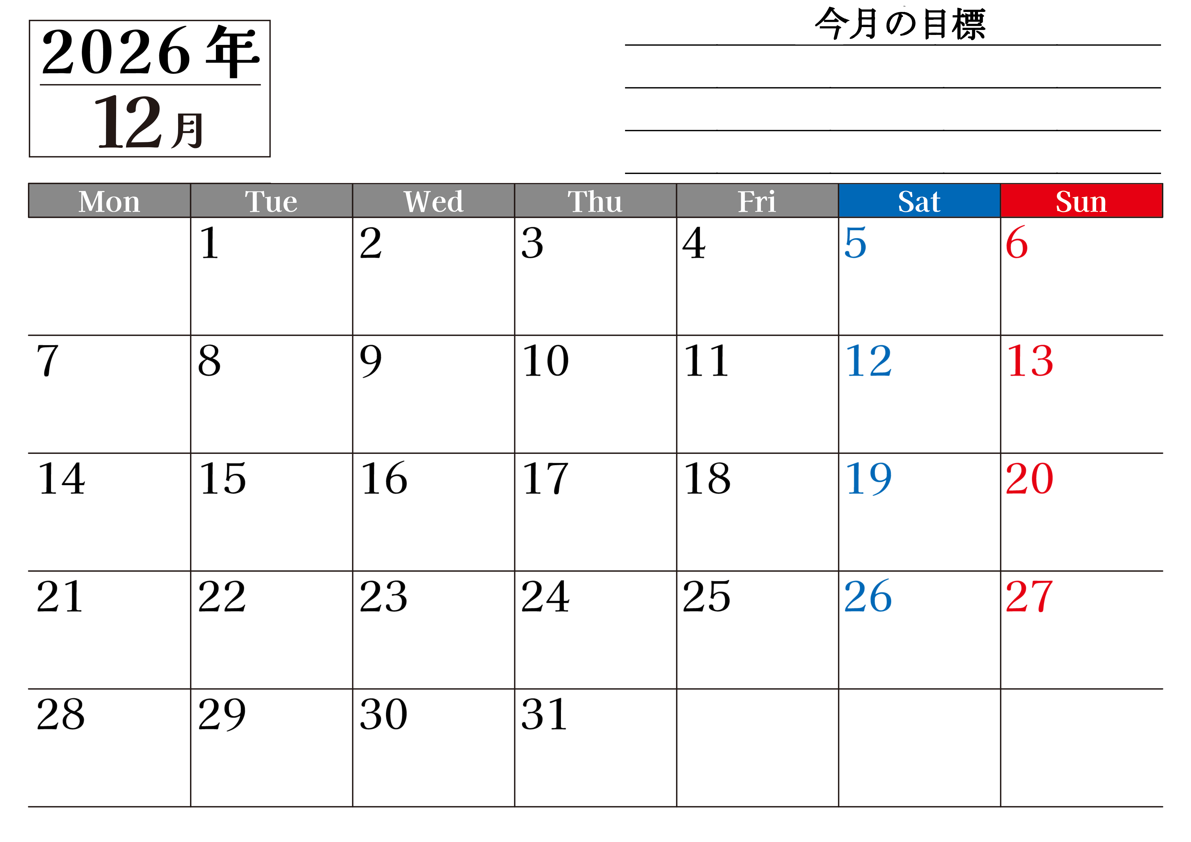 2026年・無料のカレンダーテンプレート 2026年12月カレンダーは横型月曜始まりで目標管理もできて一石二鳥!忙しい毎日をカレンダーで整理:無料(2026-01611201) 素材状デザイン王 2025年4月13日 2026年12月カレンダーは横型月曜始まりで目標管理もできて一石二鳥です。忙しい毎日をカレンダーで整理して夢を実現させましょう。ダウンロードは無料で簡単です。(2026-01611201) 12月 横型のカレンダー 月曜始まり 目標 カレンダーデザイン-0161