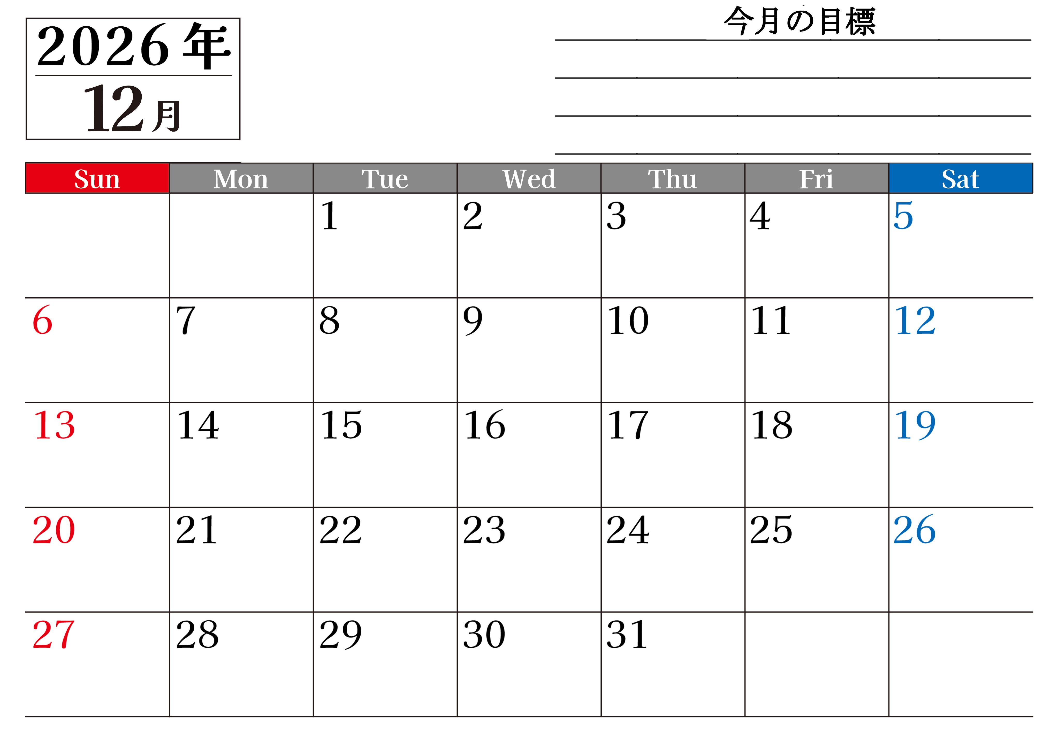 2026年12月カレンダーは横型日曜始まりで目標管理もできて一石二鳥です。忙しい毎日をカレンダーで整理して夢を実現させましょう。ダウンロードは無料で簡単です。(2026-01611200)
