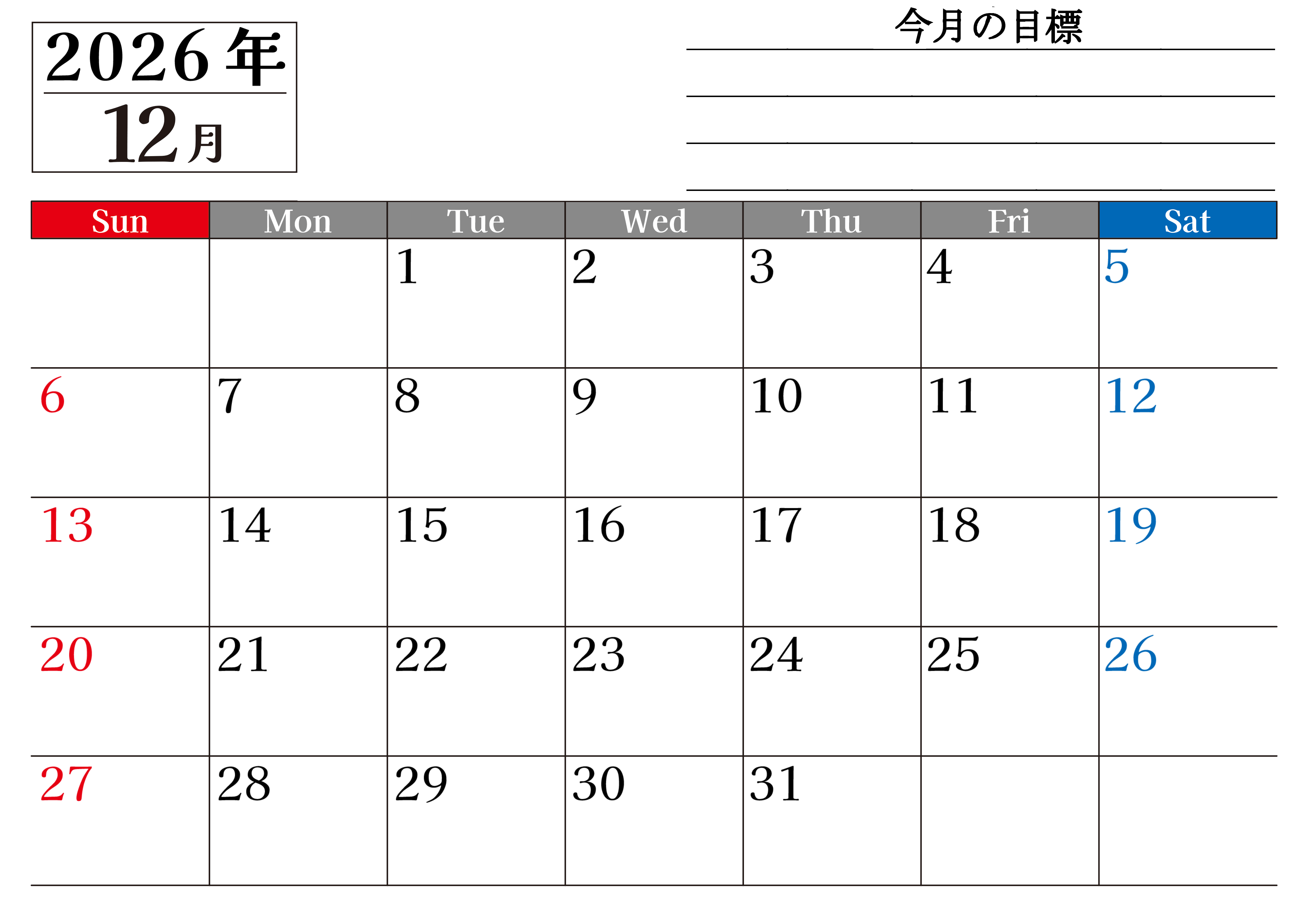 2026年12月カレンダーは横型日曜始まりで目標管理もできて一石二鳥!忙しい毎日をカレンダーで整理:無料(2026-01611200)