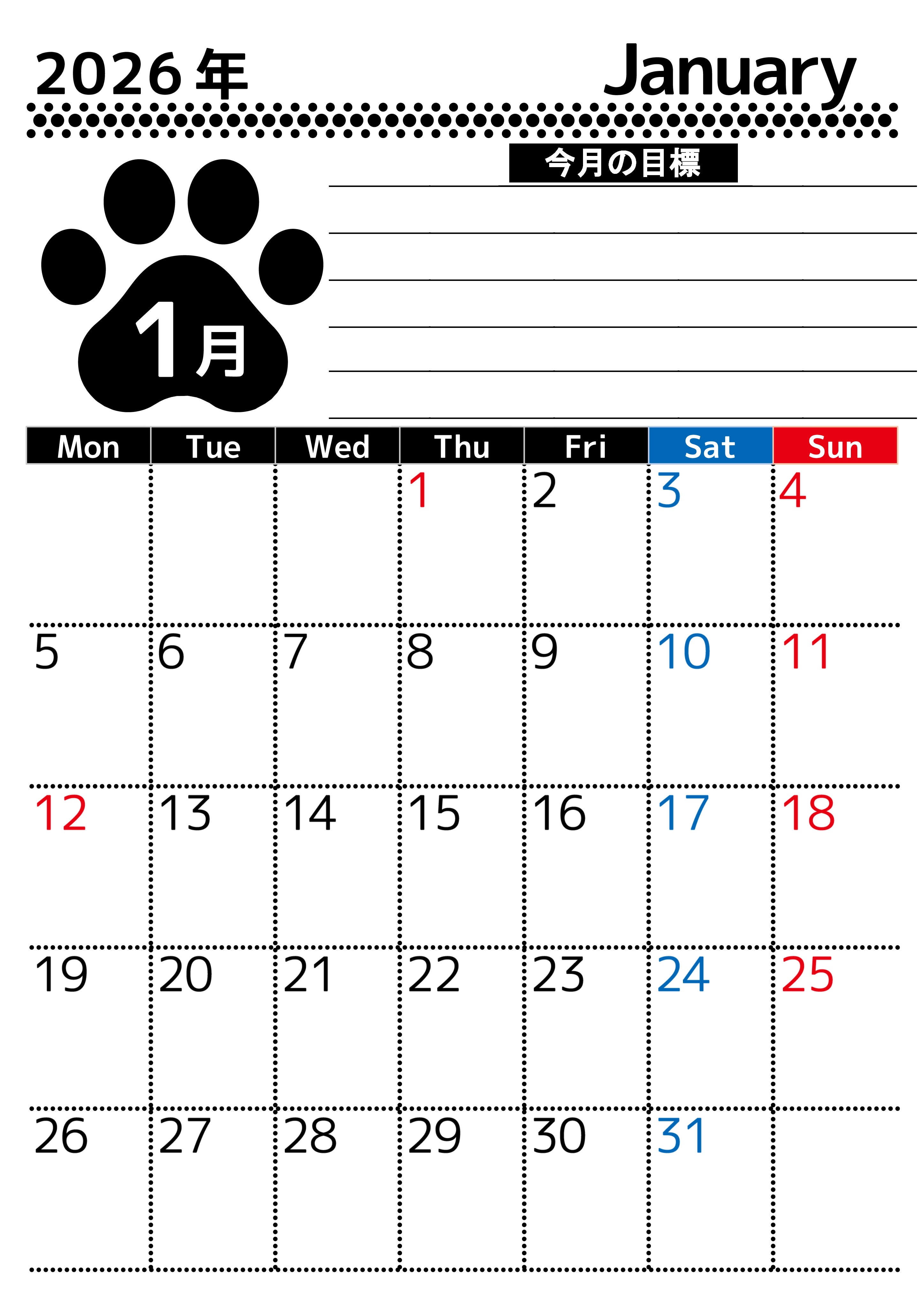 2026年・無料のカレンダーテンプレート 2026年1月カレンダーは縦型月曜始まりで目標設定を毎月できて使いやすい!ダウンロードは無料(A4)(2026-01620111) 素材状デザイン王 2025年4月13日 2026年1月カレンダーは縦型月曜始まりで目標設定を毎月できて使いやすいので勉強の継続に繋がります。ダウンロードは無料にて行えてA4サイズなので汎用性が高いです。(2026-01620111) 1月 縦型のカレンダー 月曜始まり 目標 カレンダーデザイン-0162