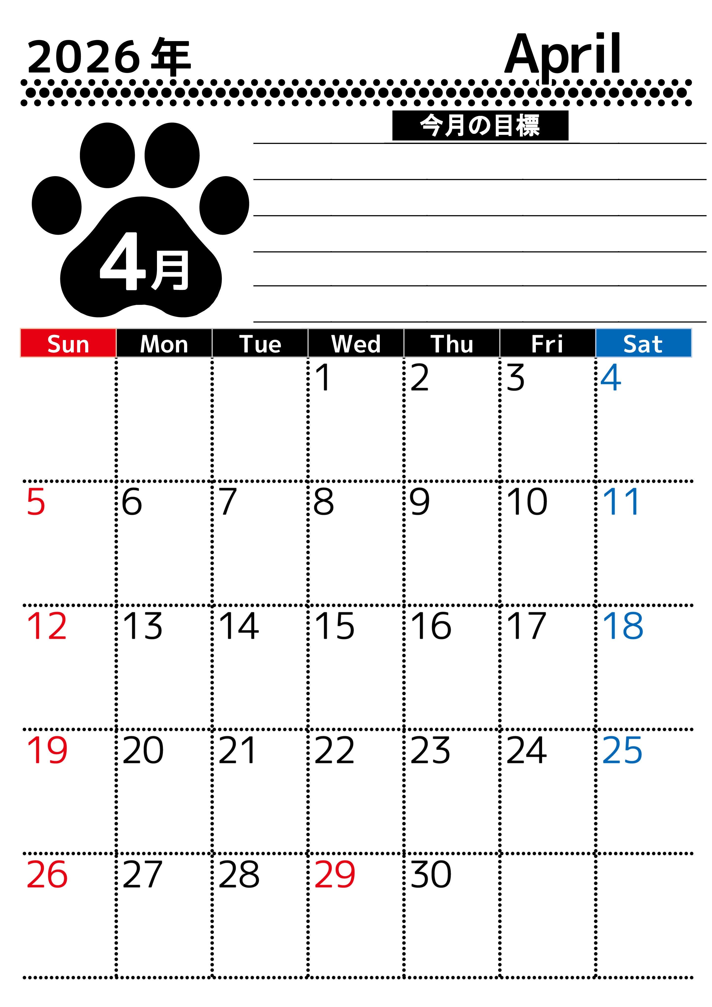 2026年・無料のカレンダーテンプレート 2026年4月カレンダーは縦型日曜始まりで目標設定を毎月できて使いやすい!ダウンロードは無料(A4)(2026-01620410) 素材状デザイン王 2025年4月13日 2026年4月カレンダーは縦型日曜始まりで目標設定を毎月できて使いやすいので勉強の継続に繋がります。ダウンロードは無料にて行えてA4サイズなので汎用性が高いです。(2026-01620410) 4月 縦型のカレンダー 日曜始まり 目標 カレンダーデザイン-0162