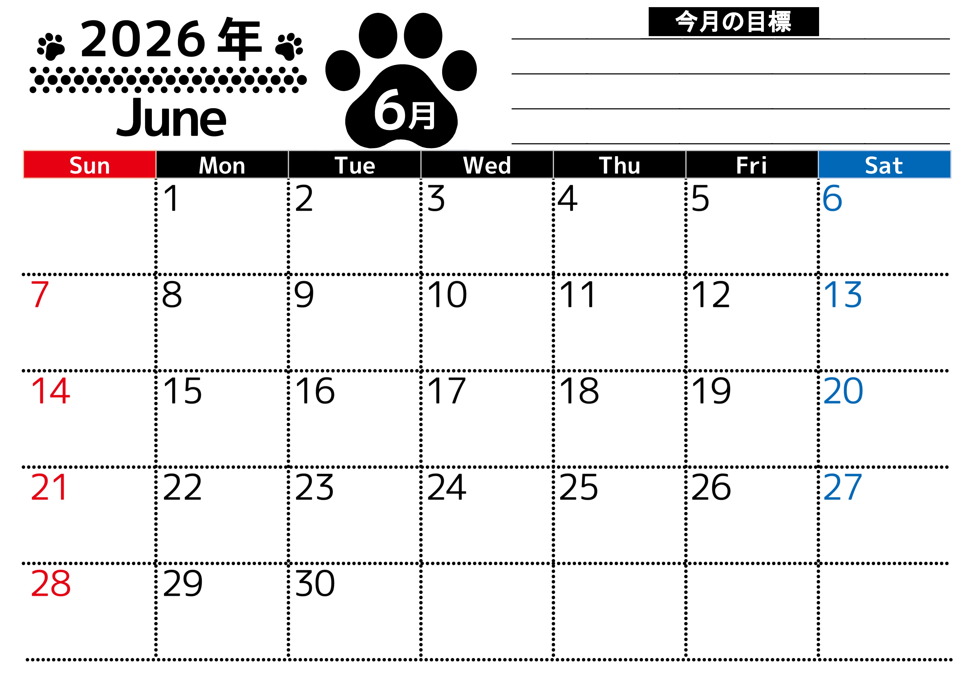 2026年6月カレンダーは横型日曜始まりで目標設定を毎月できて使いやすいので勉強の継続に繋がります。ダウンロードは無料にて行えてA4サイズなので汎用性が高いです。(2026-01620600)