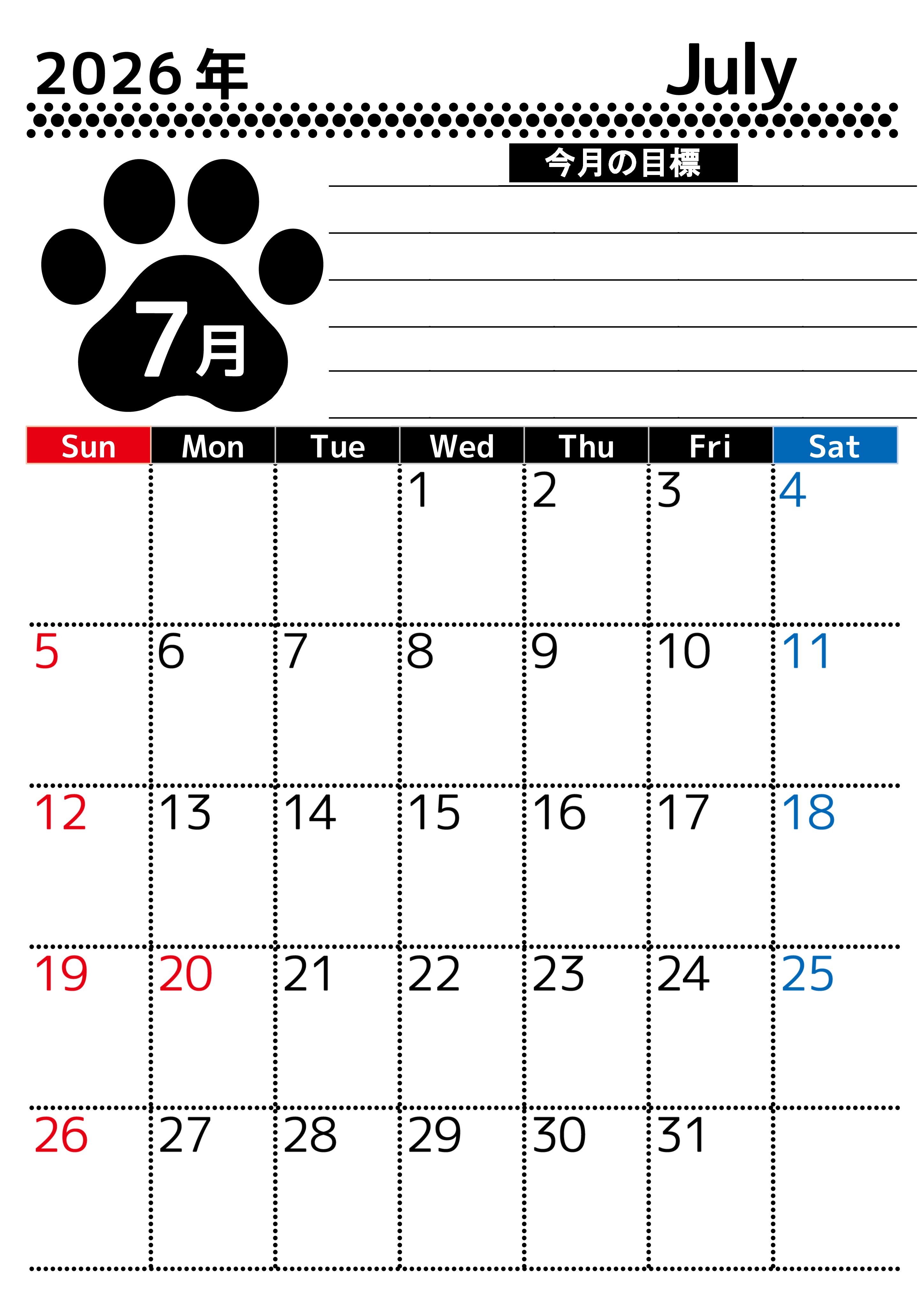 2026年7月カレンダーは縦型日曜始まりで目標設定を毎月できて使いやすいので勉強の継続に繋がります。ダウンロードは無料にて行えてA4サイズなので汎用性が高いです。(2026-01620710)