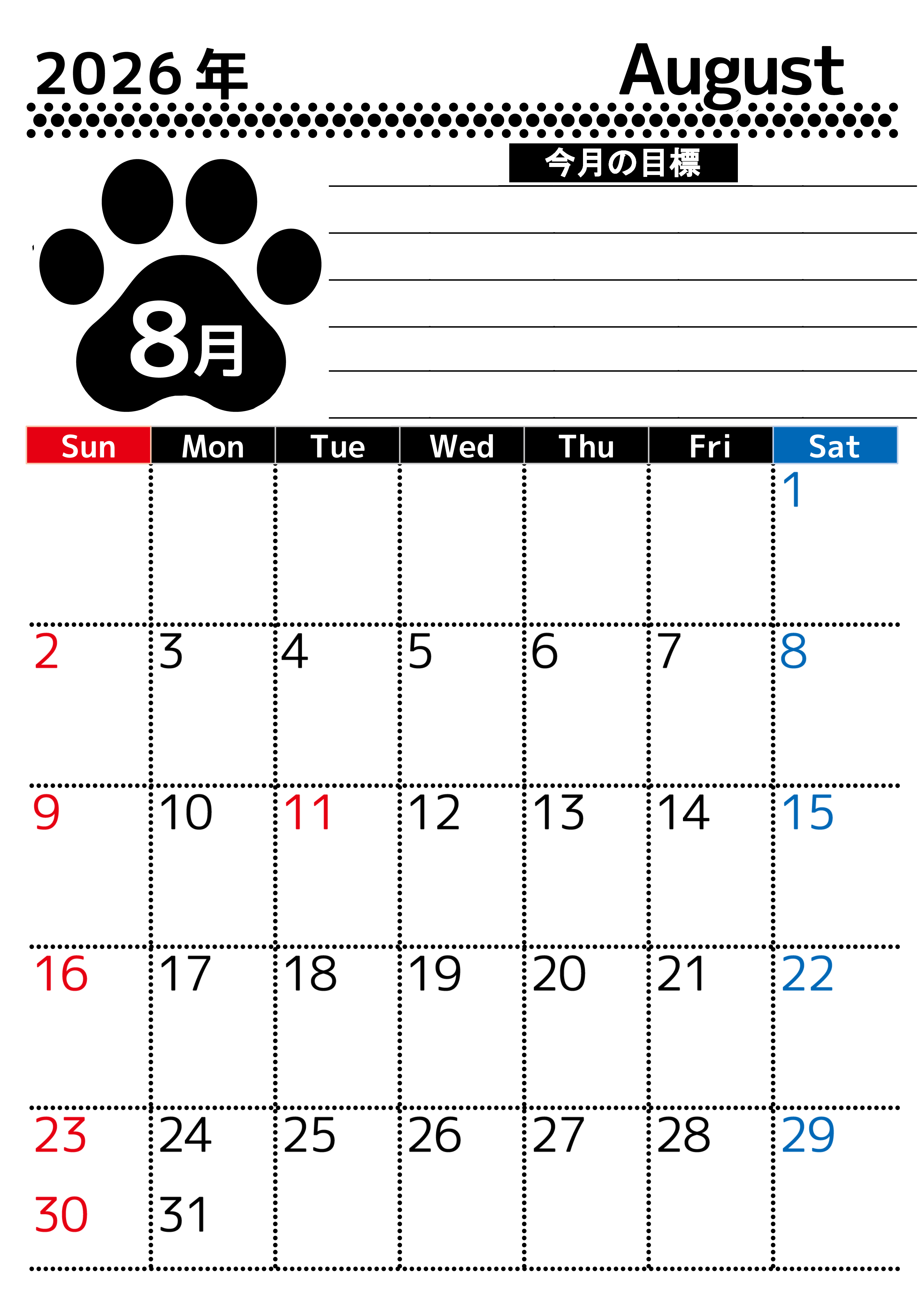 2026年8月カレンダーは縦型日曜始まりで目標設定を毎月できて使いやすいので勉強の継続に繋がります。ダウンロードは無料にて行えてA4サイズなので汎用性が高いです。(2026-01620810)