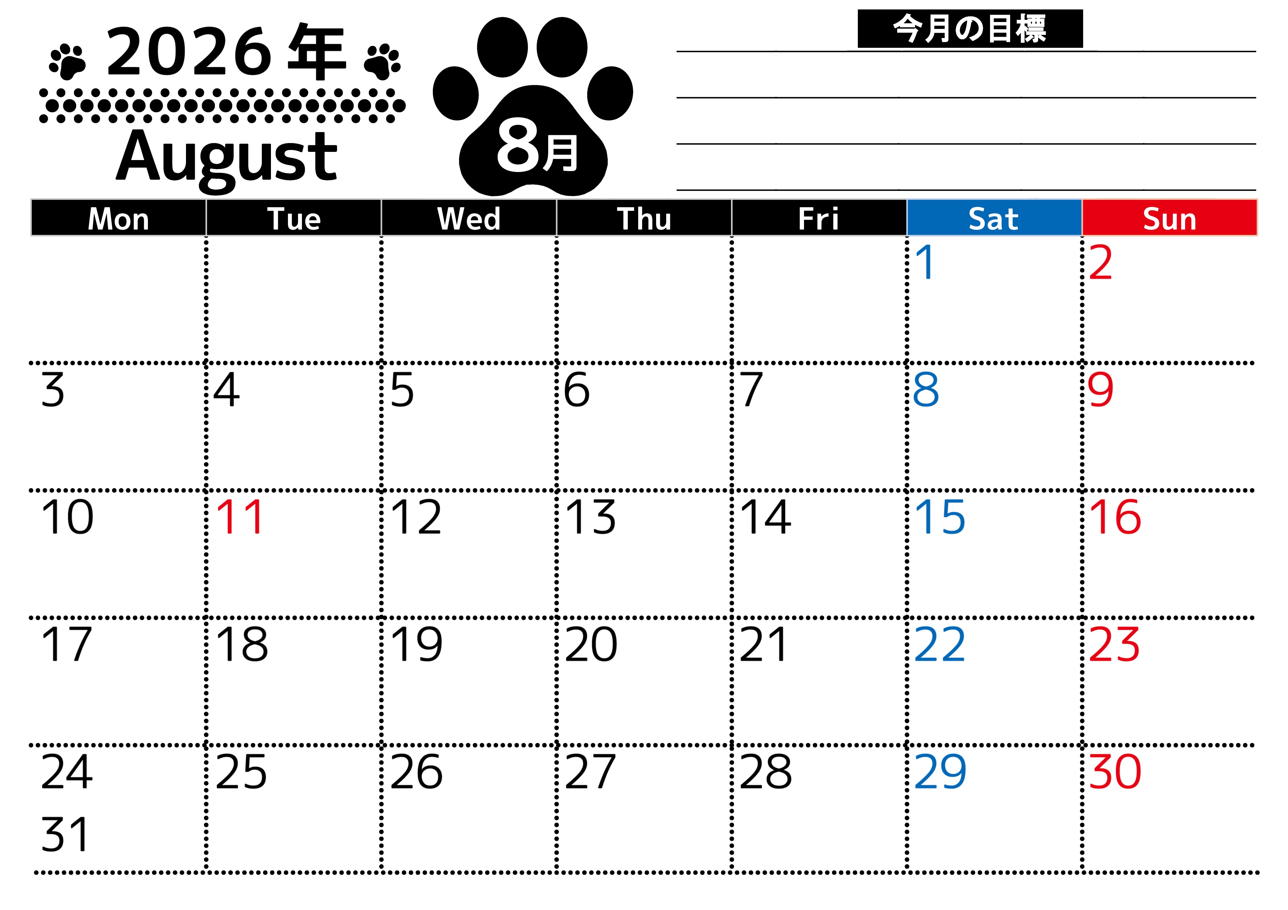 2026年・無料のカレンダーテンプレート 2026年8月カレンダーは横型月曜始まりで目標設定を毎月できて使いやすい!ダウンロードは無料(A4)(2026-01620801) 素材状デザイン王 2025年4月13日 2026年8月カレンダーは横型月曜始まりで目標設定を毎月できて使いやすいので勉強の継続に繋がります。ダウンロードは無料にて行えてA4サイズなので汎用性が高いです。(2026-01620801) 8月 横型のカレンダー 月曜始まり 目標 カレンダーデザイン-0162