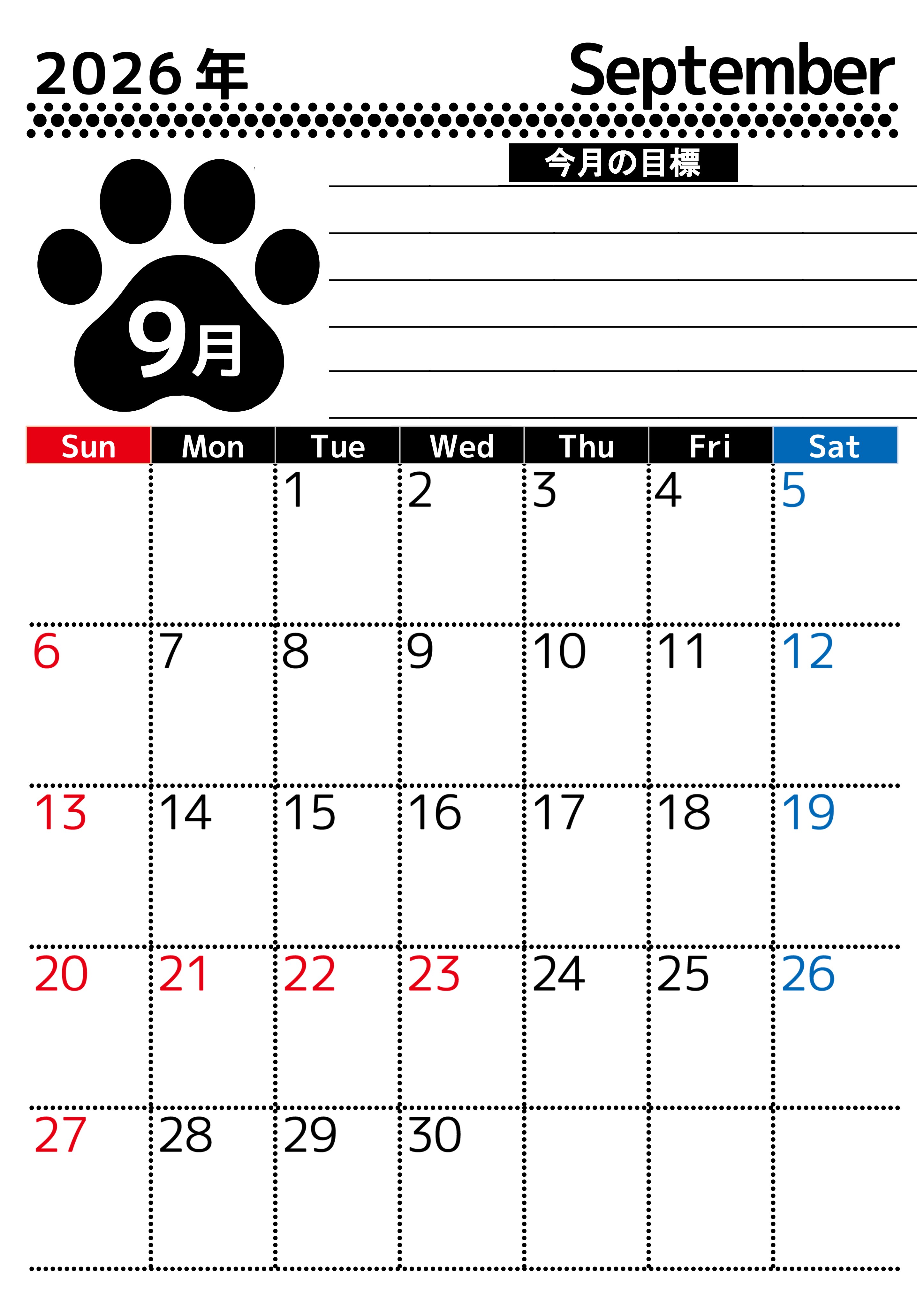 2026年・無料のカレンダーテンプレート 2026年9月カレンダーは縦型日曜始まりで目標設定を毎月できて使いやすい!ダウンロードは無料(A4)(2026-01620910) 素材状デザイン王 2025年4月13日 2026年9月カレンダーは縦型日曜始まりで目標設定を毎月できて使いやすいので勉強の継続に繋がります。ダウンロードは無料にて行えてA4サイズなので汎用性が高いです。(2026-01620910) 9月 縦型のカレンダー 日曜始まり 目標 カレンダーデザイン-0162