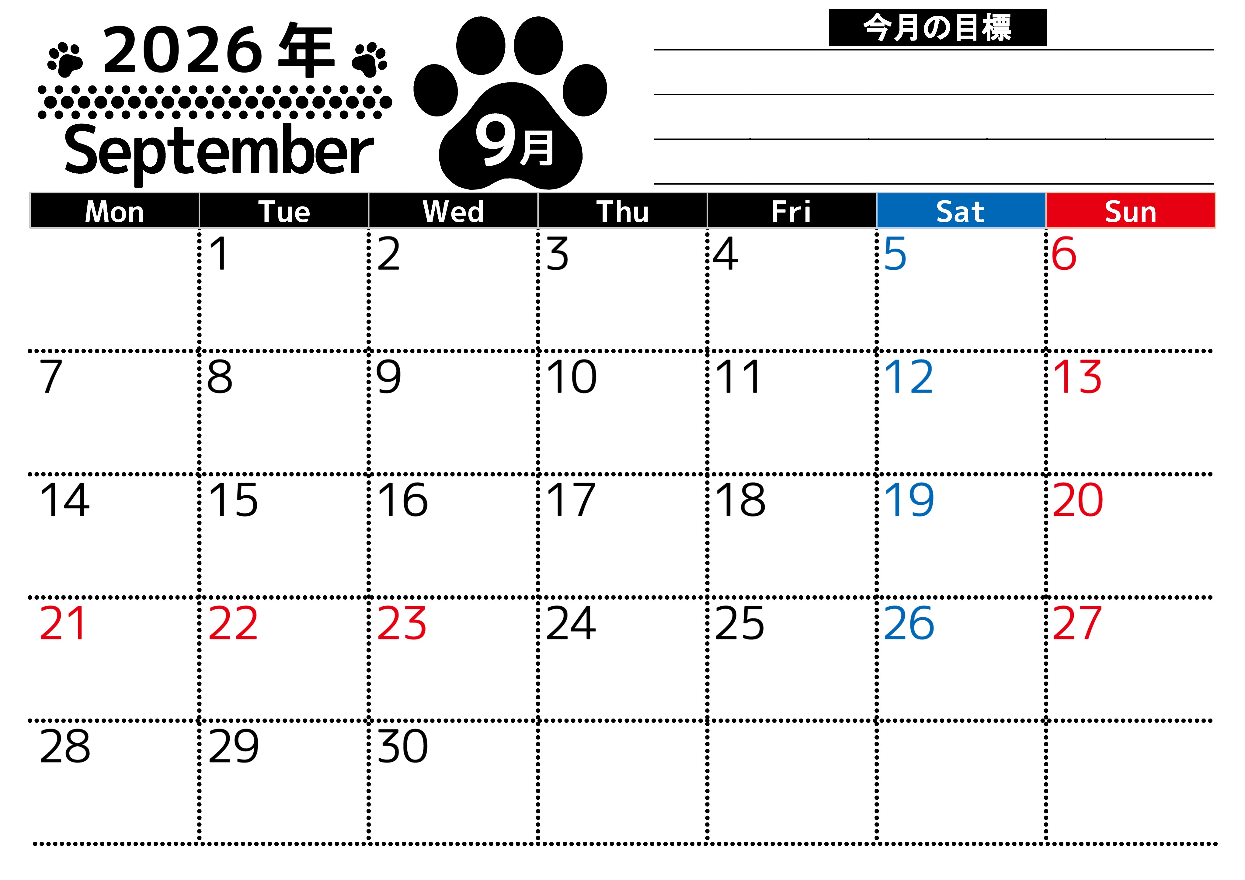 2026年9月カレンダーは横型月曜始まりで目標設定を毎月できて使いやすいので勉強の継続に繋がります。ダウンロードは無料にて行えてA4サイズなので汎用性が高いです。(2026-01620901)