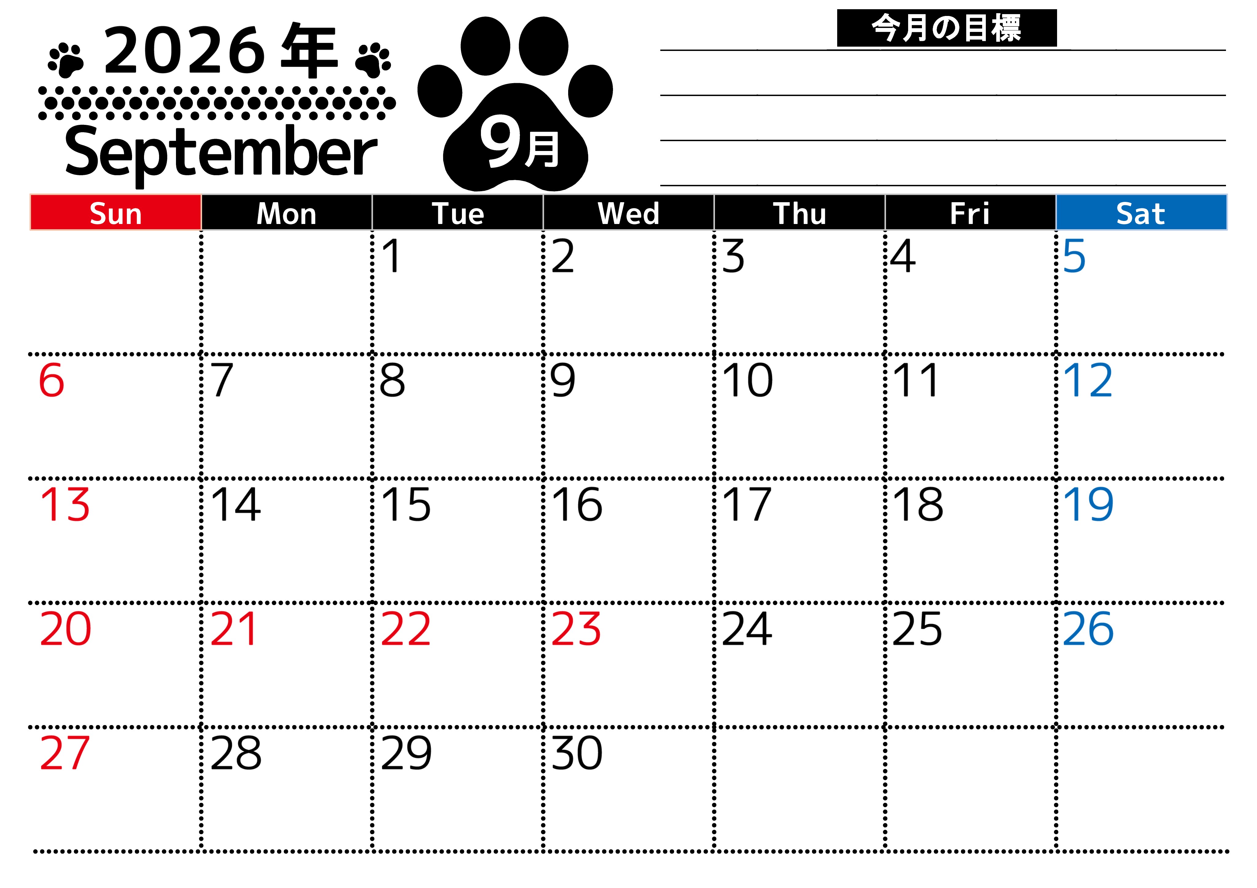 2026年9月カレンダーは横型日曜始まりで目標設定を毎月できて使いやすい!ダウンロードは無料(A4)(2026-01620900)