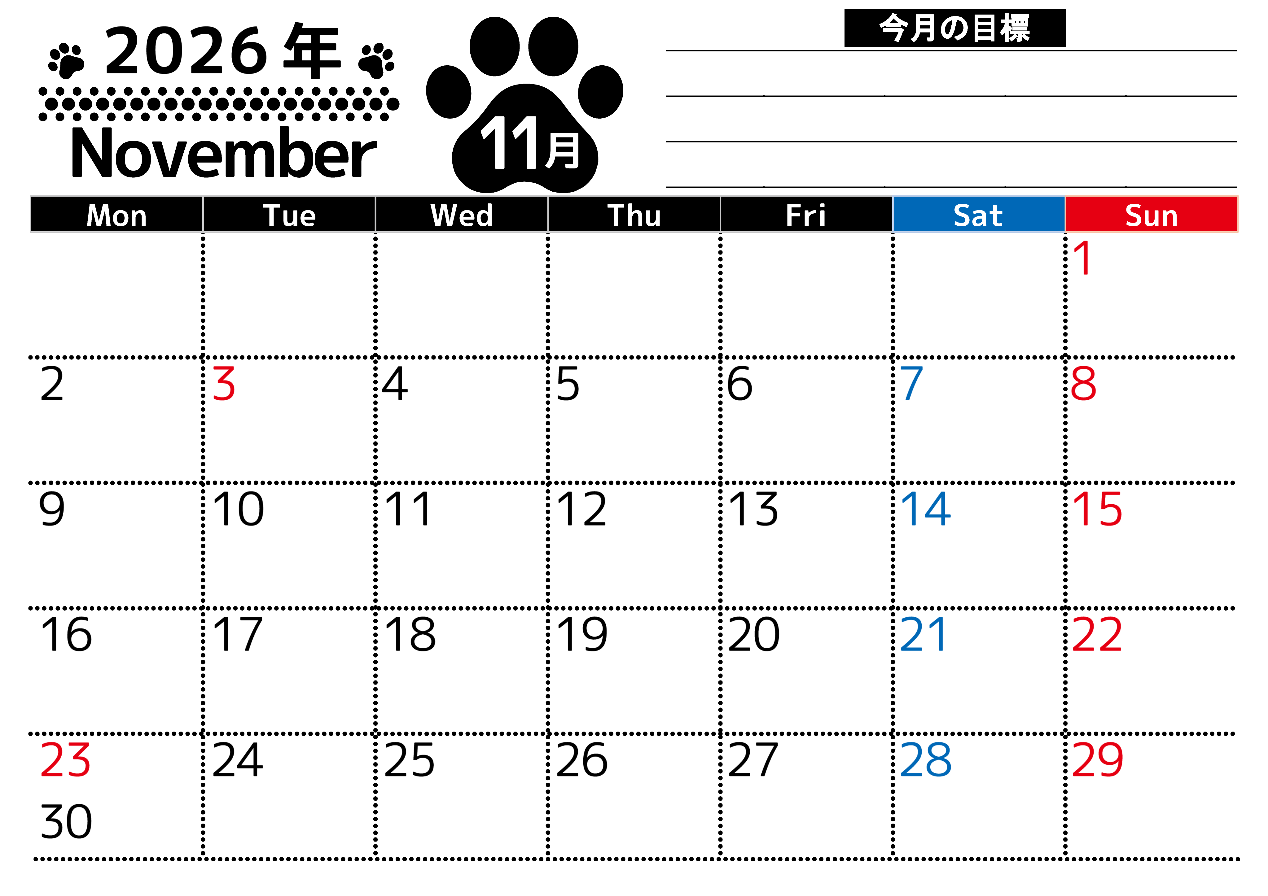 2026年・無料のカレンダーテンプレート 2026年11月カレンダーは横型月曜始まりで目標設定を毎月できて使いやすい!ダウンロードは無料(A4)(2026-01621101) 素材状デザイン王 2025年4月13日 2026年11月カレンダーは横型月曜始まりで目標設定を毎月できて使いやすいので勉強の継続に繋がります。ダウンロードは無料にて行えてA4サイズなので汎用性が高いです。(2026-01621101) 11月 横型のカレンダー 月曜始まり 目標 カレンダーデザイン-0162