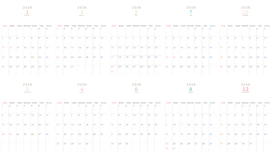 2026年のカレンダーは見やすいだけでなく、縦型・横型・日曜始まり・月曜始まりがあるので使い慣れているレイアウトをチョイスして無料でダウンロードして印刷利用をしてください。冷蔵庫に貼るもよし、机の傍の壁に貼るもよし、お好きな使い方で活用してみてください。(2026-0110)