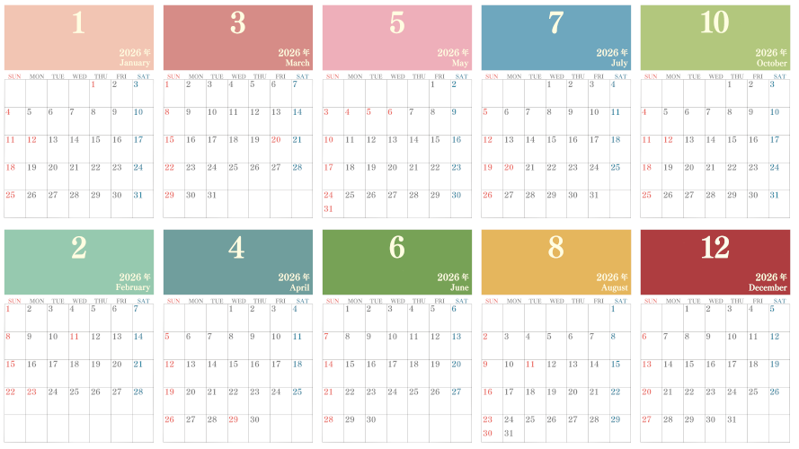 2026年のカレンダーはスケジュールをシンプルに管理できる無料素材をおすすめします。おすすめの第一ポイントは実用性です。大きい書き込みスペースを確保しているので毎日が予定でいっぱいで大忙し!タイパを上げたい!という方のニーズに応えます。