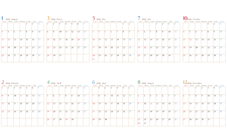 2026年カレンダー!シンプルで使いやすいフォーマットで無料ダウンロードが可能です。子どもから大人まで幅広い層にとって使いやすいすてきなカレンダーです。