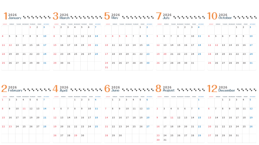 縦型・横型・日曜始まり・月曜始まり、どれも自由気ままな猫の足あとがかわいいカレンダーです。イラストつき2026年カレンダーはダウンロードを無料にて行えるので印刷して日常生活をより効率化しましょう。(2026-0122)