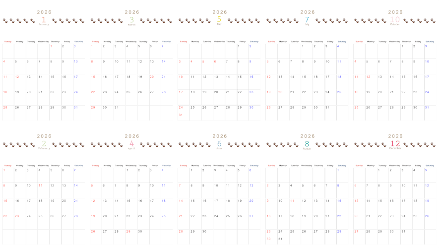 2026年の予定を自由に書き込める無料カレンダーで予定を立てませんか?猫の肉球がおしゃれなインテリアにもなじみやすいシンプルなデザインとなっています。