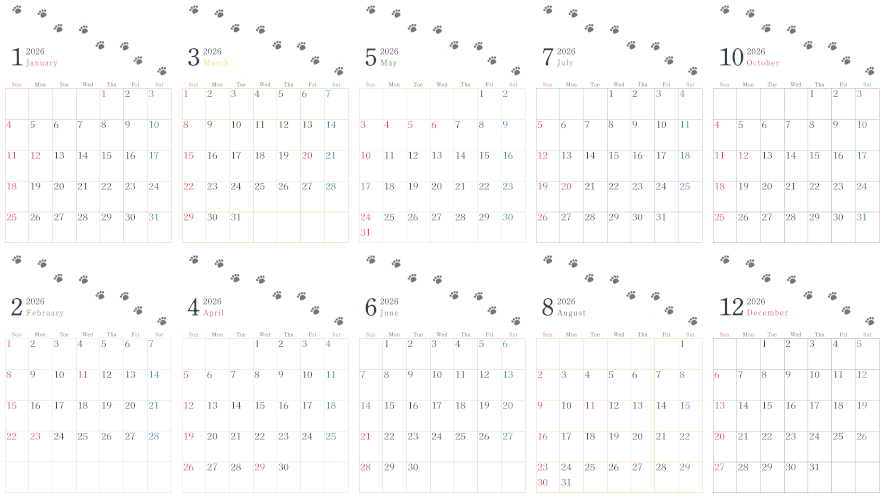 2026年は自由気ままに歩き回った猫の足あとがかわいい無料A4カレンダーがおすすめです。やさしい上品でかわいいイラストなので女性の心をくすぐる素敵なデザインとなっています。無作為に付けられた猫の足あとが想像を掻き立てるあわいいデザインです。ただかわいいだけではなく、大人の女性がときめくようなすてきなイラストを取り入れているのがおすすめポイントのカレンダーです。
