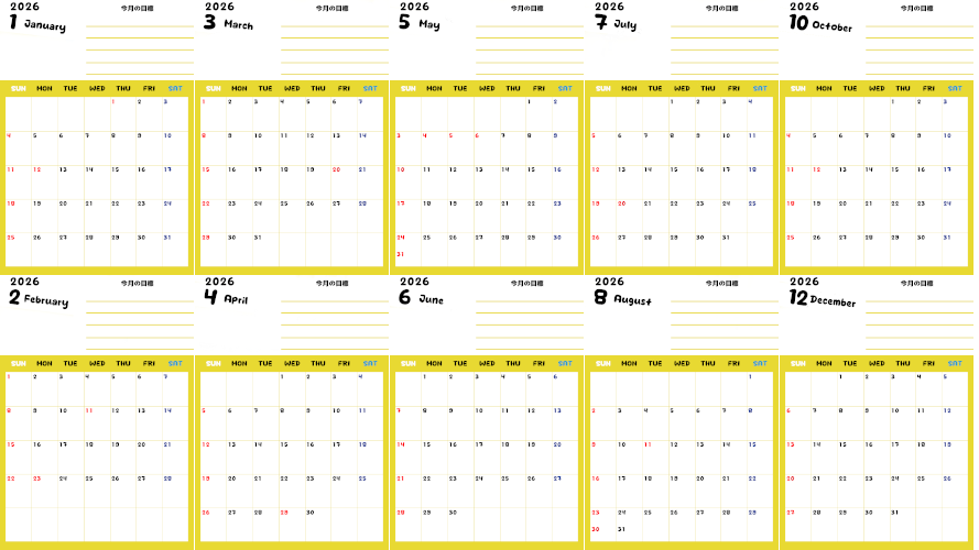 2026年の無料A4カレンダーで一年の目標を気持ちよく達成しましょう。かわいい小さい数字文字なので毎日の予定を書き込む余白が大きいです。予定を沢山書き込めます。それだけでなく毎月の目標も書き込めるスペースも確保されています。