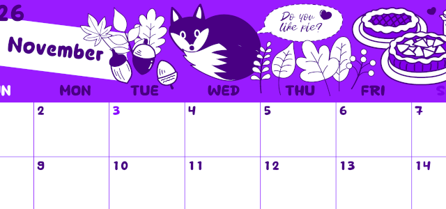 2026年11月横型月曜始まり アップルパイのイラストがかわいいA4無料パープルのカレンダー(2026-01001101)