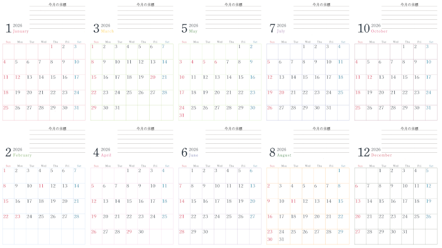 縦型・横型・日曜始まり・月曜始まり、すべてA4サイズで完全無料です。印刷するだけですぐに使えるので忙しいけど目標もしっかり達成したいという方にもぴったりの2026年カレンダーです。(2026-0156)